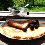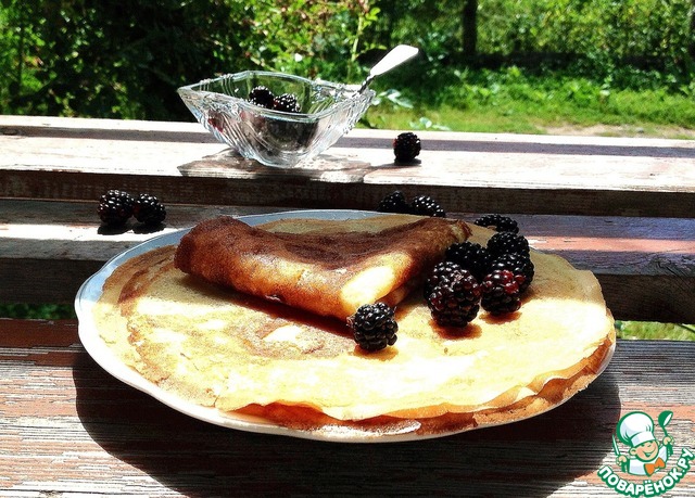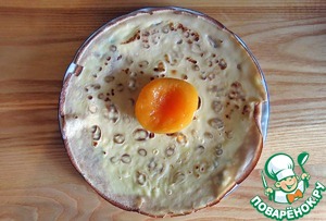 На готовый блин, кладем половинку персика, срезом вверх. -