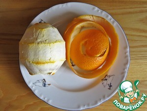 Из 1 ст. л. сахара и 50 мл. воды (этого нет в ингредиентах) готовим сироп (мешаем до растворения сахара), опускаем туда цедру, доводим до кипения. Если вода, покрывает цедру не полностью - переворачиваем. Буквально, 20 сек. и выключаем. Остывшую цедру разрезаем ножницами на ленточки. Она очень податлива.