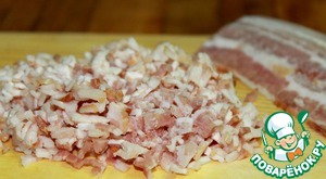 Бекон очень мелко нарезать и вытапливать на среднем огне, пока он не станет золотистым и хрустящим.