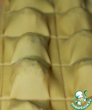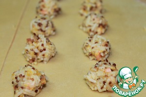 Взять небольшую часть теста, хорошенько припылить его мукой и раскатать в пласт толщиной 1-2 мм. Примерно через каждые 4 см выложить фарш величиной с грецкий орех.