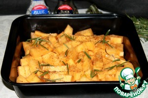 Тыкву очистить от кожуры, нарезать крупными брусочками, посолить, поперчить, полить оливковым маслом, посыпать листиками розмарина и запекать при 180 * С 15 -20 минут. Вынуть из духовки, остудить до комнатной температуры.