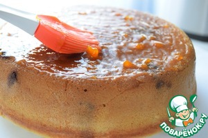 Абрикосовый джем нагреем в микроволновке при максимальной мощности 30-40 сек. Обильно смажем теплым джемом верх кекса.