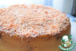Посыпаем верх кокосовой стружкой и украшаем консервированными абрикосами (так было у автора рецепта). Я украсила вафельными цветочками.