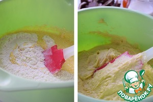 Просеянную муку смешать с разрыхлителем и, небольшими порциями, добавить в яично-масляную смесь, хорошо каждый раз перемешивая лопаточкой.
