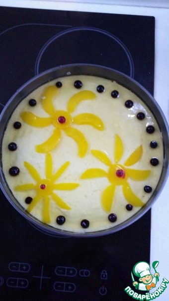 Сверху на бисквит с персиками выкладываем творожную массу. И ставим в холодильник минут на 40.