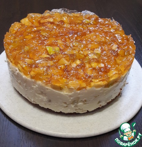 Украсила торт оставшимися персиками и ананасами консервированными и залила персиковым желе. Оставила торт на ночь в холодильнике.