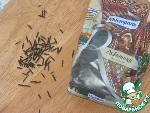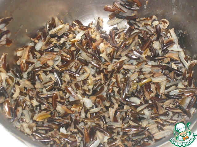 • Основа салата - дикий рис с зёрнами тёмного цвета.