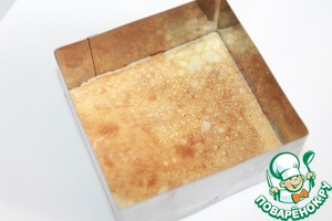Выкладываем в форму два прямоугольных блинчика. Смазываем кремом. Затем еще два и так до верха. Немного отступаем, для желе и ягод. Можно класть по одному блинчику.