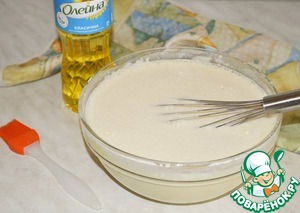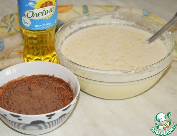 Замешиваем тесто из всех ингредиентов и отливаем 4 ополонника для шоколадных блинчиков.