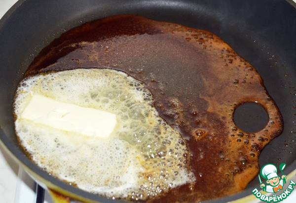 Сахар отправляем на сухую сковороду и доводим до состояния карамели. Ни в коем случае не мешаем на этом этапе! Добавляем сливочное масло и топим его, покачивая сковородой по кругу и не помешивая при этом!
