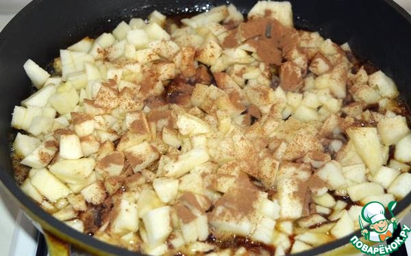 Отправляем в сковороду наши яблоки и корицу! Оставляем томиться 2 минуты и только потом начинаем немного помешивать начинку.