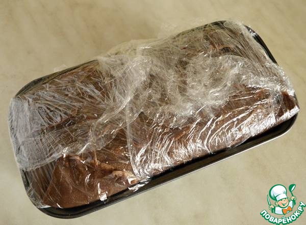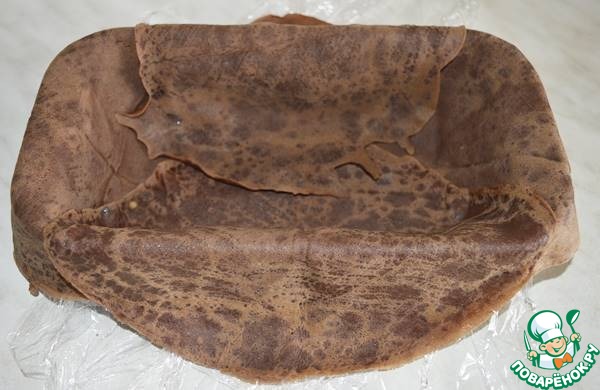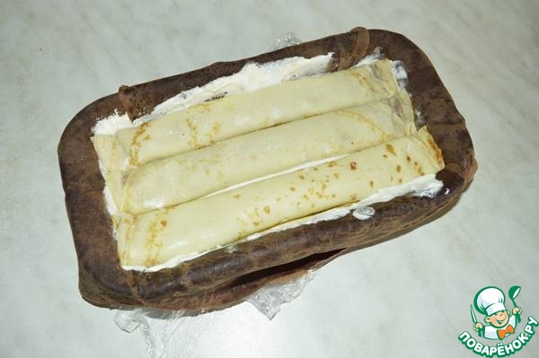 Форму для выпечки кекса или хлеба выстилаем пищевой пленкой и укладываем шоколадные длины внахлест, чтобы бока блинов свисали с краев формы.