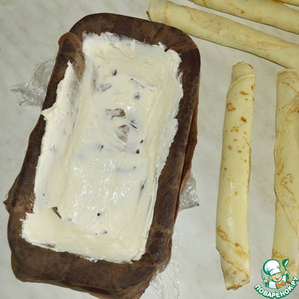 Третий ряд блинчиков покрываем кремом и подворачиваем свисающие края блинов. Укрываем пищевой пленкой и отправляем в холодильник для застывания на 2-3 часа.