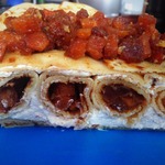 Снова покрываем блинчики кремом и укладываем следующий ряд. Повторяем процедуру еще раз - получаем три ряда перемазанных блинчиков.