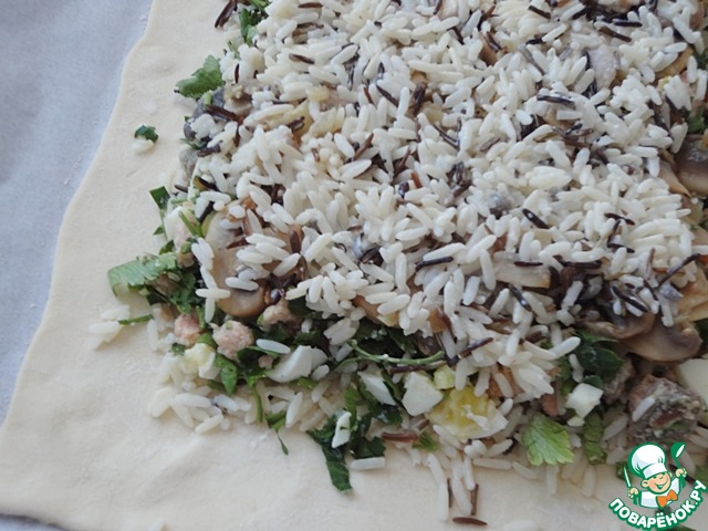 Рецепт «Слоеный пирог с рыбой, грибами и рисом»: