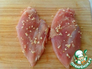 Филе помыть, обсушить бумажным полотенцем, слегка отбить и обмазать мелко рубленным чесноком, смешанным с солью. Оставить на 20 минут.