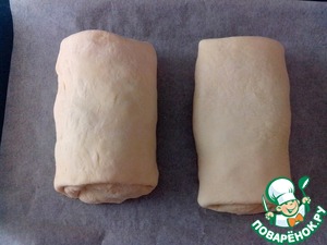 Плотно завернуть и выложить швом вниз на противень, застеленный бумагой для выпечки.