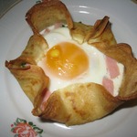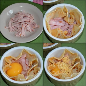Далее в каждый блинчик на ветчину вбить по яйцу. Делать это надо аккуратно, чтобы яйцо не вытекло из блинчика. И желательно, чтобы желток остался целый.