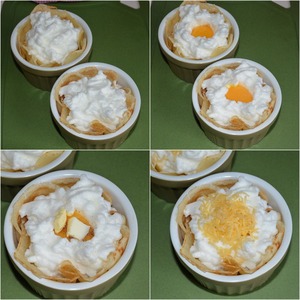 Аккуратно выложить в блинчики взбитые белки. Затем ложкой сделать углубление, куда осторожно вылить желток.