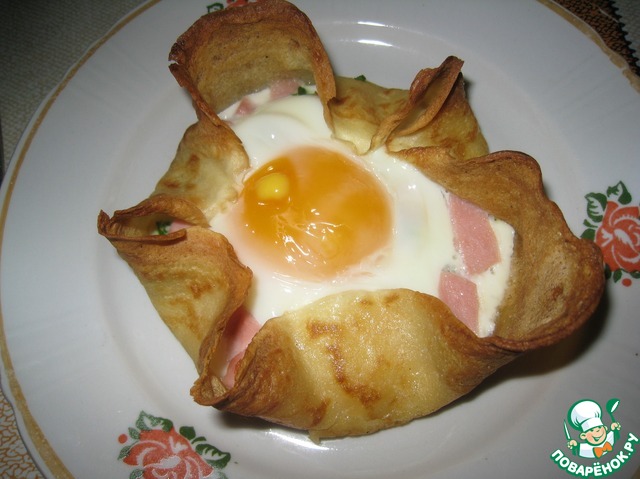 Мне очень нравится идея завтрака из яиц в блинных корзиночках. Решила поделиться и с вами, дорогие поворята. Возможно и вам понравится такой завтрак. А он (завтрак) в таком виде, поверьте, очень интересно смотрится на столе и поднимает настроение на весь день. К тому же и очень вкусно. В этом рецепте я расскажу две идеи, два варианта. Первый вариант, простой и банальный - яйца с ветчиной или колбасой (или любыми другими колбасными изделиями). Второй - яйца "Орсини" (от Юлии Высоцкой). Оба моих примера рассчитаны на две порции.