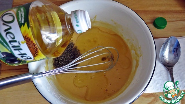 Далее добавляем оливковое масло. У меня подсолнечное с добавлением оливкового, ТМ "Олейна". Также добавляем базилик. Смешиваем до однородной массы и вводим молоко.