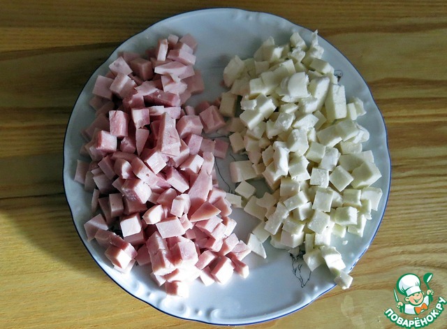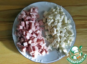 Тем временем, можно нарезать кубиками - сыр и ветчину. Смешивать их не нужно.