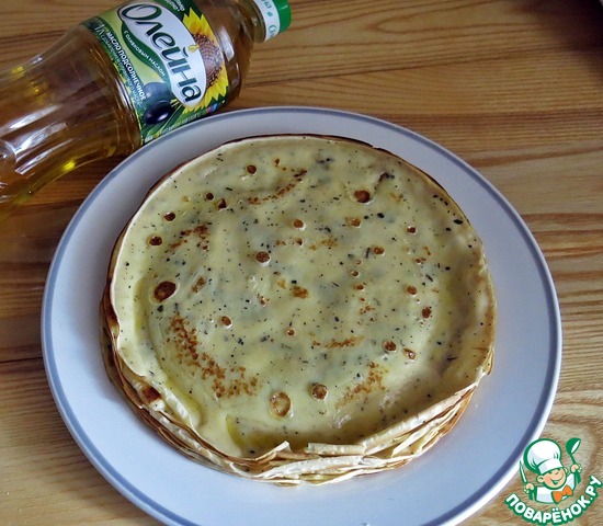 На этом с начинкой пока всё, т. к. она у нас - быстрозастывающая. Теперь нам нужно испечь блины, чтобы потом быстренько разложить начинку в готовые блинчики.