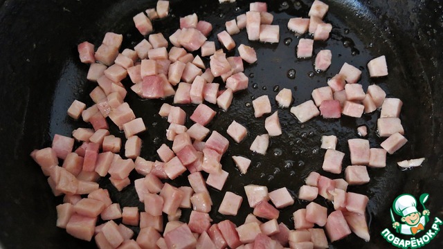 Теперь можно закончить приготовление начинки. Ветчину обжариваем до румяности в 1 ст. л. сливочного масла.