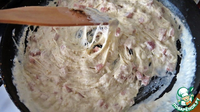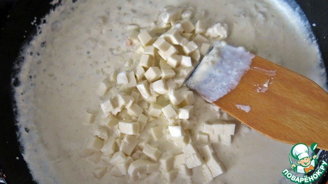 Затем вливаем сливки и после закипания, тушим ещё 2 мин. Добавляем моцареллу и снимаем с огня (!!). Перемешиваем всё до полного растворения сыра. Это очень быстро происходит.