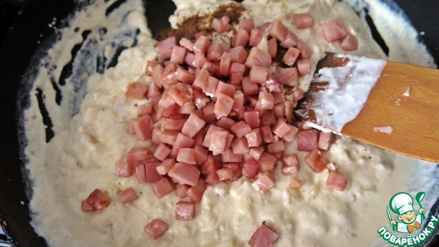 После растворения сыра, добавляем ветчину, мускатный орех, всё быстренько перемешиваем и солим по вкусу. Не забудьте посолить, начинка абсолютно пресная.