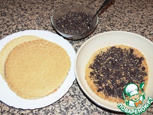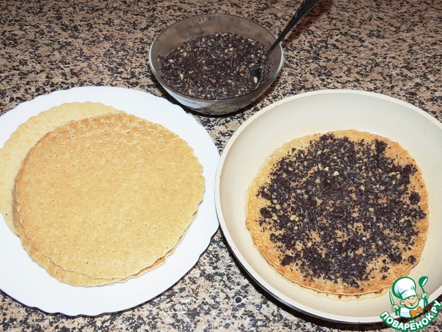 На каждый блин выложить по 1 ст. ложке начинки, распределить. В подходящую форму выкладывать блины стопкой, прижимая. Верхний блин оставить без начинки, смазать его растительным маслом и присыпать сахаром. Этого количества начинки хватило на 10 блинчиков диаметром 20 см.