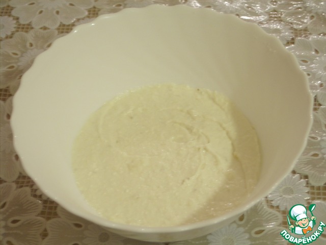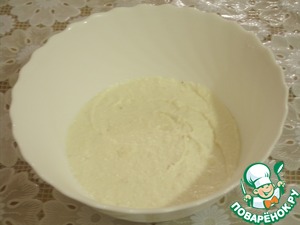 Для начинки взбиваем миксером или блендером творог, сметану, сахар и измельченный банан.