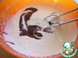 Растапливаем шоколад на водяной бане и добавляем в смесь, взбиваем