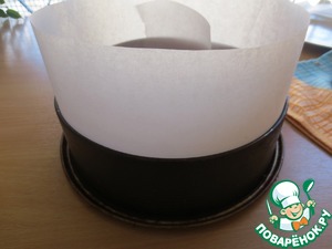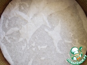 Дно круглой формы (27 см) застелить бумагой для выпечки, смазать маслом