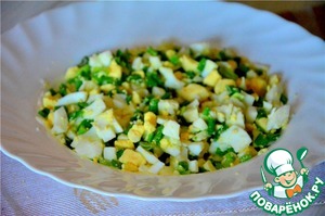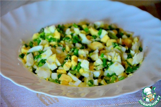 Делаем начинку. Вареные яйца мелко режем, так же поступаем с зеленым луком. Смешиваем в чашке, солим по вкусу
