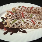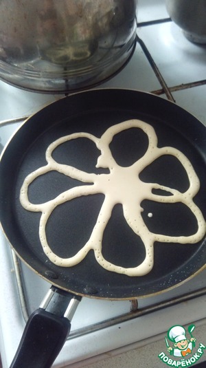 Замесить тесто. Дать настояться минут 30. Затем взять небольшую пластиковую бутылку, в крышке сделать небольшую прорезь и налить часть теста в бутылку. На разогретую сковороду выливать тесто, создавая узоры.