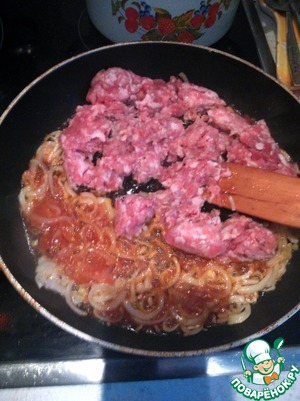 Добавляем кетчуп, обжариваем 2-3 минуты. Закидываем фарш (любой). Жарим минут 7.