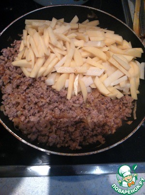 Тем временем картофель режем соломкой, добавляем к фаршу.