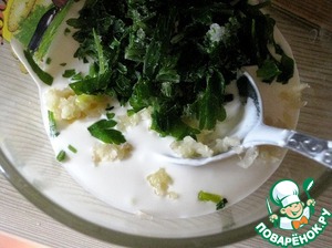 Смешать сметану, соль, чеснок и зелень