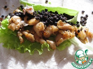 Обжарить мелко нарезанную курятину, посолив ее. Отварить чечевицу.