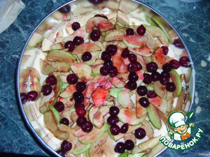 выложить часть теста на дно, положить нарезанные яблоки, вишни