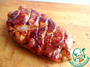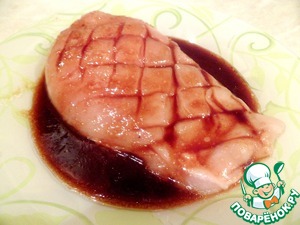 Грудку надрезать по диагонали и залить остывшим соусом на 30 минут для маринования.