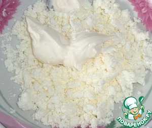 В миске смешиваем творог, сахар, корицу и сметану.