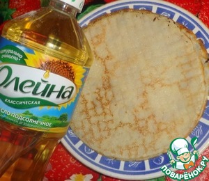 Жарим блины по своему фирменному рецепту, я в тесто для блинов добавила подсолнечное масло ТМ Олейна. Пока блины остывают, приготовим начинку.