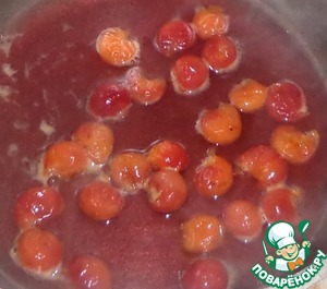 В кастрюлю выливаем воду и шампанское, ставим на огонь. Добавляем сахарную пудру. Доводим до кипения и добавляем в сироп вишню без косточек. Проварить 3-5 минут на медленном огне.
