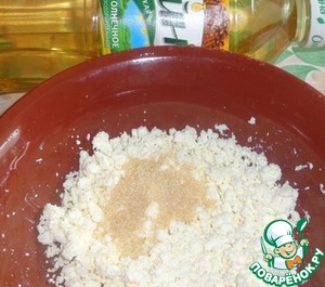 Творог размять вилкой и смешать с тростниковым сахаром.