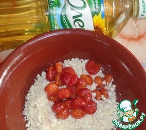 • Вишню достать из сиропа и соединить с творогом. Перемешиваем аккуратно.