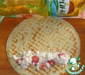 Выкладываем начинку на блины и заворачиваем в трубочку.