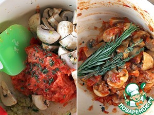 Лук и чеснок мы мелко порежем, обжарим в половине подсолнечного масла, за тем добавим к ним грибы, томаты и листья тимьяна, потушим без крышки минут 5, выпаривая лишнюю жидкость, помешивая. За тем добавим еще масло, соль, сахар и уксус, еще немного повыпариваем. Выключим плиту, добавим при желании петрушку, сверху положим по веточке тимьяна и розмарина, накроем крышкой и оставим минут на 30, чтобы начинка пропиталась ароматами.
