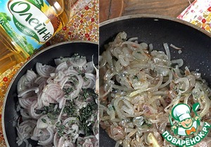 В сковороду с разогретым подсолнечнмы маслом кладем лук, листья тимьяна, чеснок (зубчики, раздавленые прямо в шкурке, целиком), немного соли и перца, и обжарим минуты 4-5 до полуготовности лука. Посмотрите. он должен стать полупрозрачным.